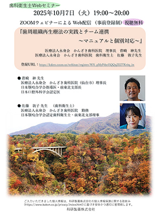 『歯周組織再生療法の実践とチーム連携-マニュアルと個別対応-』というタイトルで、当院で毎日行っている歯周基本治療について紹介しました。当日は全国で放送され、200名以上の方にご視聴いただきました。